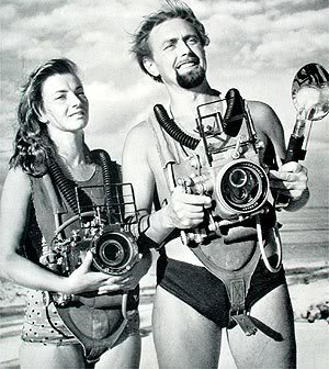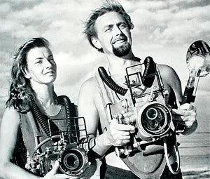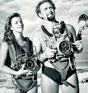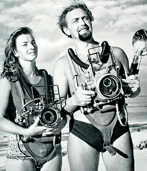 Dans les années 40 et 50, on fait appel aux appareils de type 6X6. Hans Hass, le pionnier allemand, met au point un caisson destiné au Rolleiflex, c’est le Rolleimarin. Luis Marden du National Geographic en fera grand usage pour illustrer les aventures d’un français dont la notoriété s’étend outre-Atlantique : Jacques-Yves Cousteau
