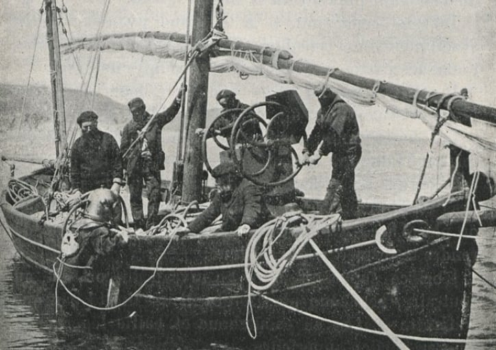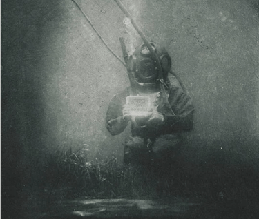 Vêtu de son lourd scaphandre, Louis Boutan pénètre les eaux de la mer Méditerranée au large de Banyuls dans le sud de la France. Boutan réalise les premières images sous-marines de qualité à la fin du XIXe siècle. En 1903, il publie un ouvrage décrivant les techniques utilisées pour produire ces photographies. Vous pouvez télécharger une version PDF de son livre en cliquant ICI.