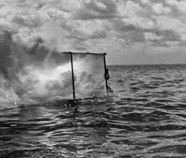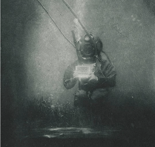 L’un des premiers portraits sous-marins réalisés par Louis Boutan. Le plongeur — Boutan lui-même — semble tellement enthousiaste qu’il tient l’écriteau à l’envers. On peut y lire « Photo sous-marine ».