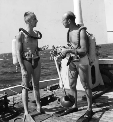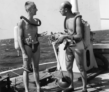 Luis Marden (à droite) avec Jacques-Yves Cousteau à bord de la Calypso. Marden tient un boîtier Rolleimarin. Photo de Pierre Goupil.