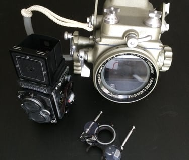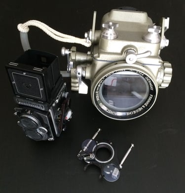 L’appareil photo Rolleiflex monté sur la moitié supérieure du boîtier Rolleimarin.